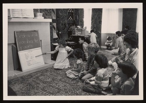 Whakaahua matua: Ngā tamariki e ako ana i te reo Māori ki tētahi hōtaka Raumati, i te tau 1983, Tapuaka – Heritage & Archive Collections, ref: VUVCP0293.