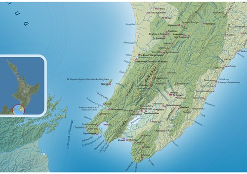 Whakaahua matua: He kapomata o te mahere whenua Te Ika-a-Māui map, the Land and its People. I tīkina ake i te pae tukutuku o Toitū Te Whenua Land Information New Zealand, i te tau 2025.