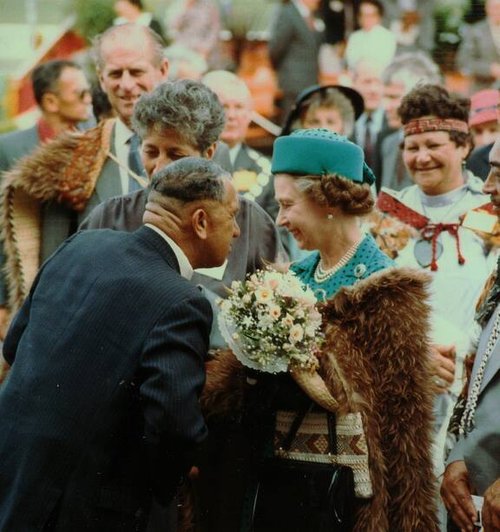 Kua rite a Taanga Tomoana ki te hongi ki a Kuīni Irihāpeti te Tuarua, i Heretaunga i te tau 1986. Whakaahua nā NZME.