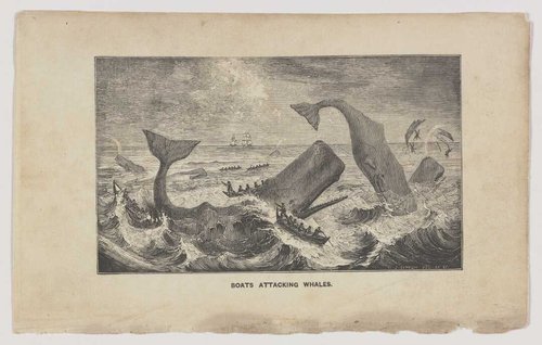William James Linton (1812-1898). Engraving of boats attacking whales (1830s). Ref: A-109-046. Alexander Turnbull Library, Wellington, New Zealand. /records/22859435